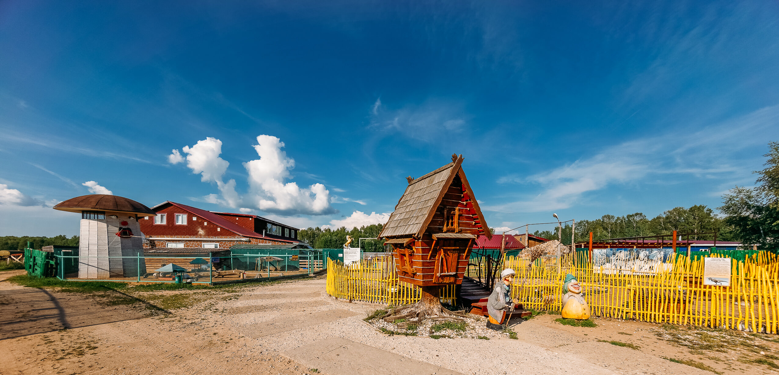 За ней вы можете увидеть ряд уютных желтых гостевых домиков. Для людей, любящих уединение и тишину - они наилучший выбор. В каждом доме есть коридор со шкафом-купе, ванная комната с душевой кабиной, кухня, спальня, гостиная комната с дополнительными спальными местами.