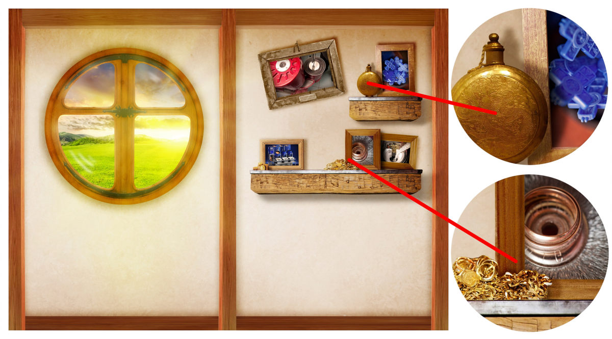 Нарисовал от руки что где будет располагаться. Отснял все стены последовательно для визуализации/коллажа. Затем нашёл картинки подходящей тематики: золотые изделия, винтажные весы и предметы, круглые окна и фактуры. Дизайнер стала отрисовывать и комбинировать элементы сообразно наброску.