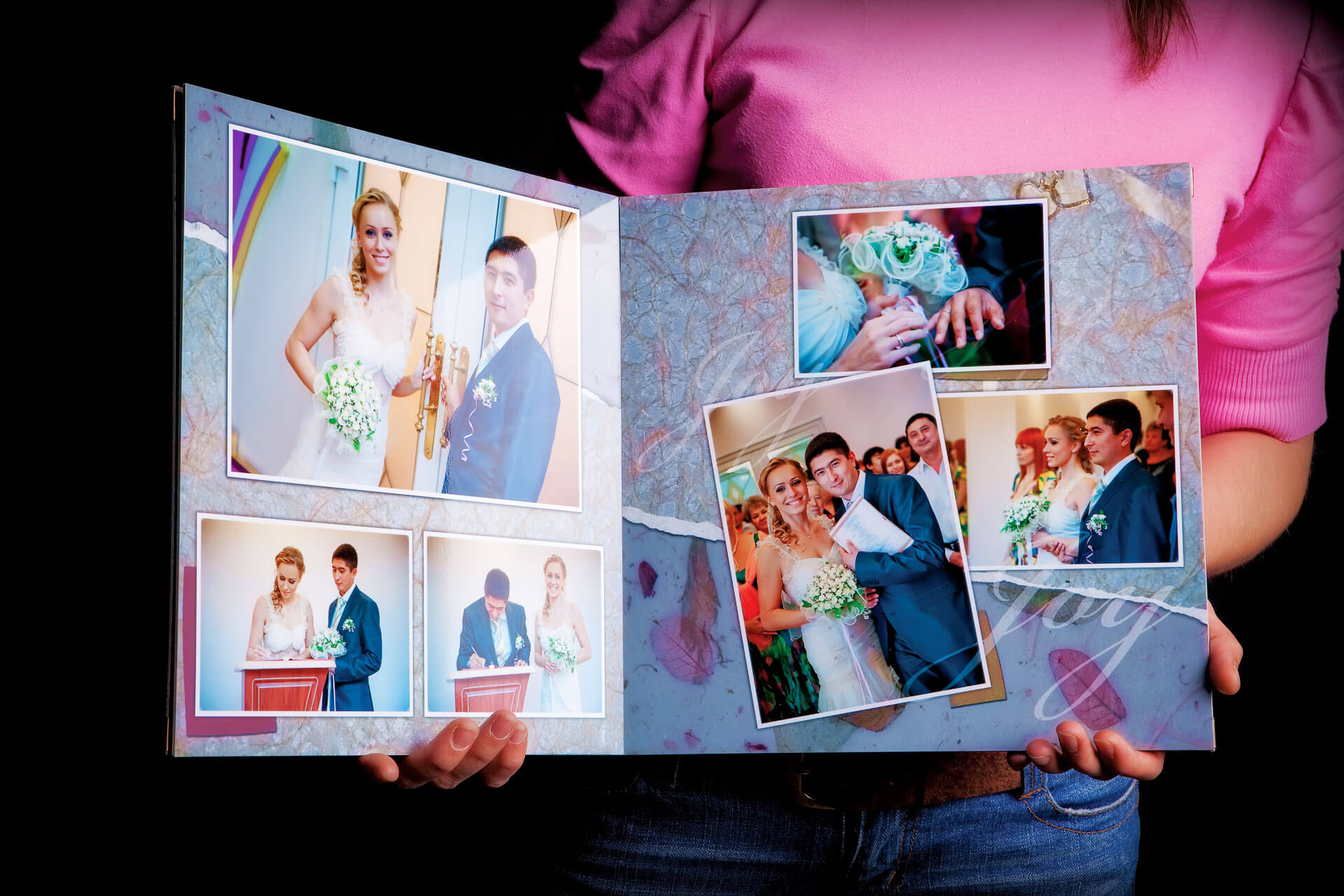 Папка изготавливается методом фотопечати на качественной бумаге, склеивается на основе плотного картона и обрезается по периметру. Изделие получается абсолютно ровное. В отличии от готовых папок с вклеенными фотографиями, есть ряд преимуществ: - никаких пузырей - фотография не может отклеиться - все страницы с индивидуальным дизайном