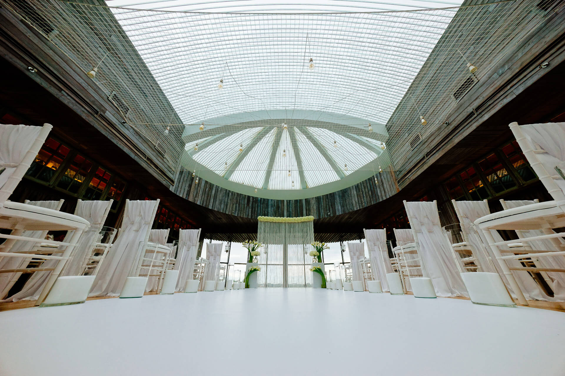 Интересная ситуация заключалась в том, что были оформлены 2 зала. Один, основной зал ресторана, был украшен для проведения выездной регистрации. А просторная летняя терраса украшена для самого банкета. Основой стиля стала просьба заказчиков сделать все белым на белом. Главные цветы вечера - калы. Над свадебным столом висели круглые вазочки с живыми цветами. Так же были оформлены фотозона с банером, стенд со схемой посадочных мест. Пригласительные, книгу пожеланий и прочие мелочи так же выполнила компания "Мастерская упаковки".