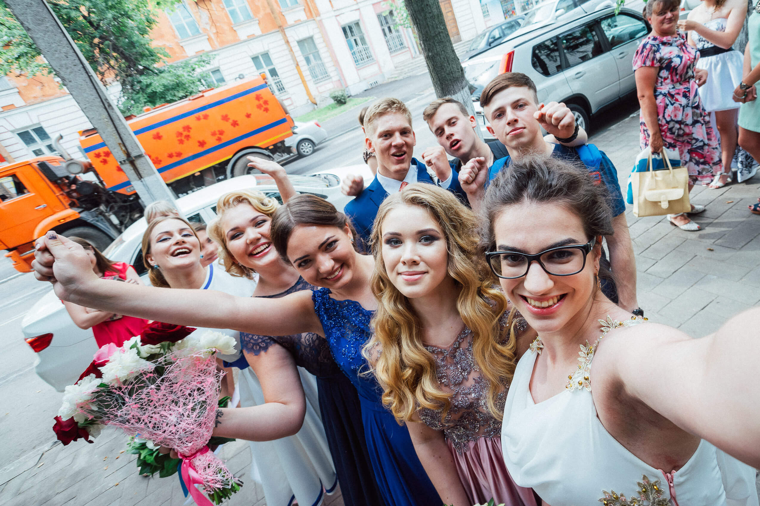 Фотография в стиле модного селфи - отличная идея для веселой групповой фотографии, в том числе и на выпускном.
