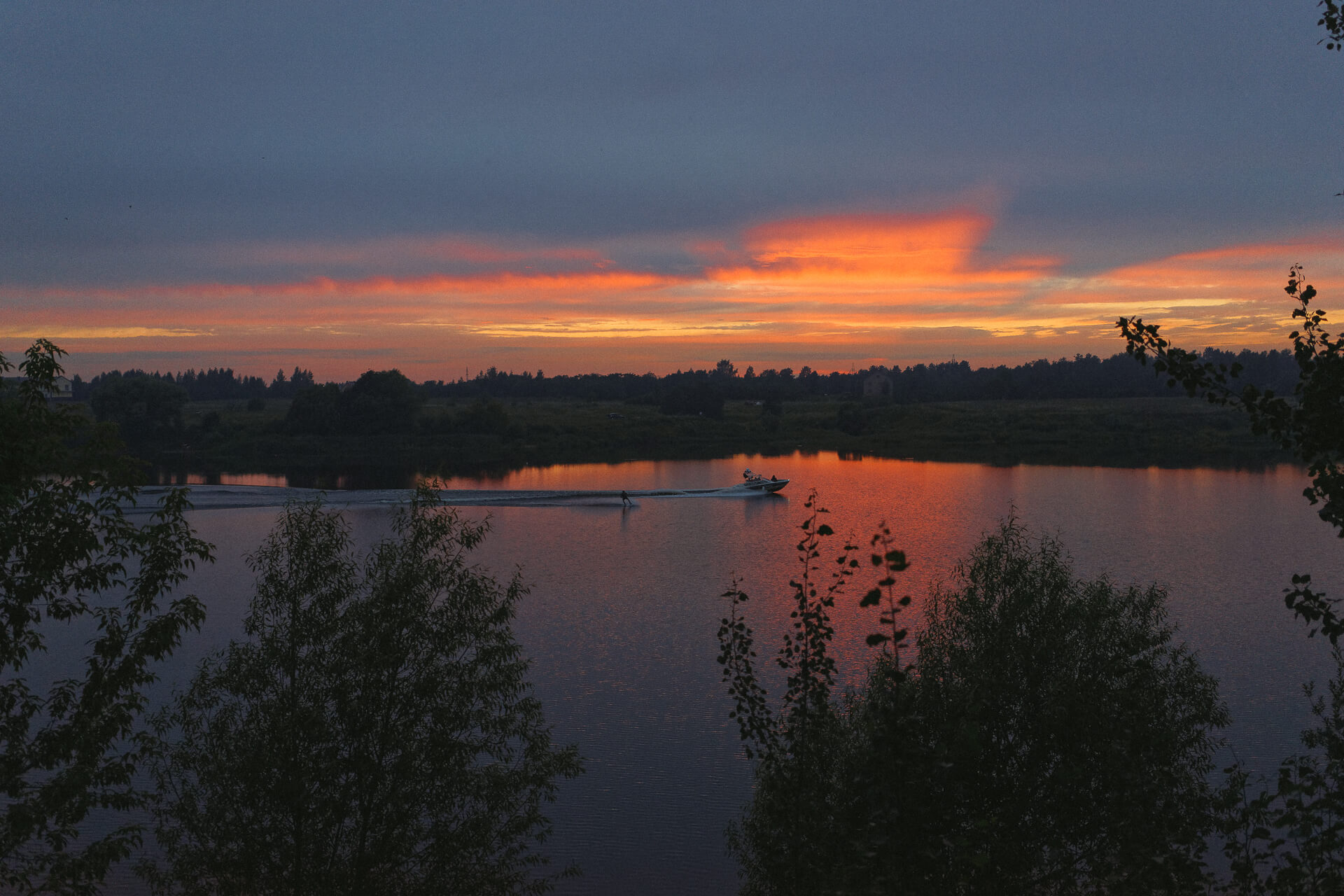 Кто-то рассекает по Волге на водных лыжах на фоне великолепного заката.